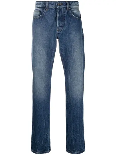 blue cotton mid-rise button fly fastening belt loops classic five pockets faded effect slim cut logo patch to the rear