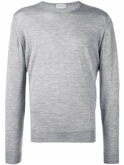 Grey wool crew neck jumper from John Smedley featuring long sleeves and a ribbed hem and cuffs.