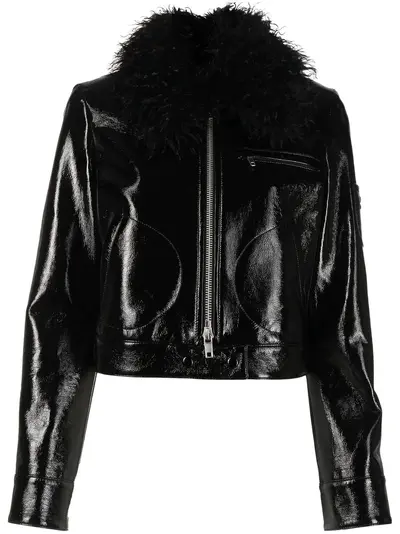 jet black cotton blend faux leather faux-shearling trim faux-shearling collar front zip fastening long sleeves two side slit pockets straight hem