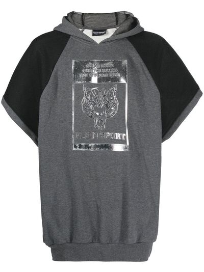 graphic-print short-sleeve hoodie from PLEIN SPORT featuring grey, black, cotton blend, graphic print to the front, classic hood and short raglan sleeves.