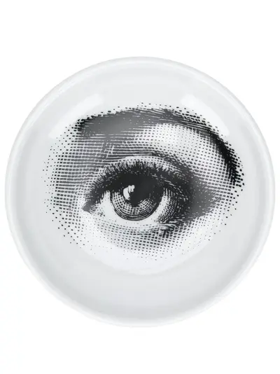 White/black porcelain Lina Cavalieri-print trinket tray from FORNASETTI featuring round face and graphic print.