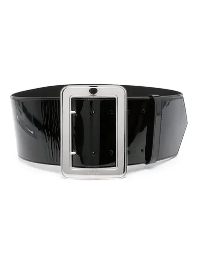 black calf leather patent finish wide style logo-engraved buckle silver-tone hardware punched holes adjustable fit buckle fastening