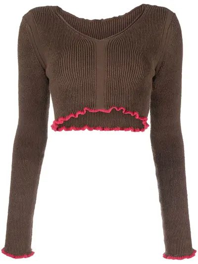 chocolate brown linen blend ribbed knit V-neck long sleeves cropped lettuce hem contrasting trim
