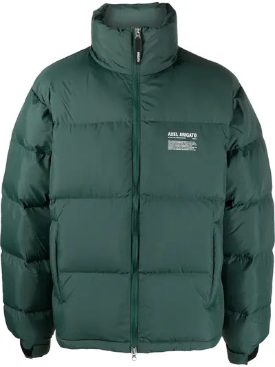 green recycled down padded design logo print to the front high neck front zip fastening long sleeves two side slit pockets Conscious: This item is made from at least 50% recycled or upcycled materials. For recycled synthetic clothing products we highly recommend using a microfibre-catching washing bag to ensure that no microplastics that can pollute water are released in the process.