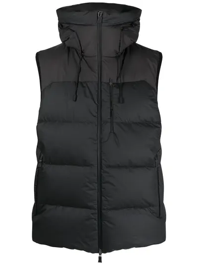 black slate grey feather down padded design high neck drawstring hood sleeveless front two-way zip fastening two side zip-fastening pockets straight hem