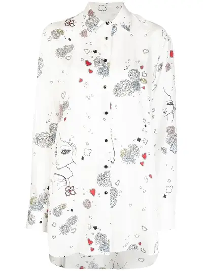 white/multicolour silk all-over print classic collar front button fastening long sleeves buttoned cuffs straight hem thigh-length