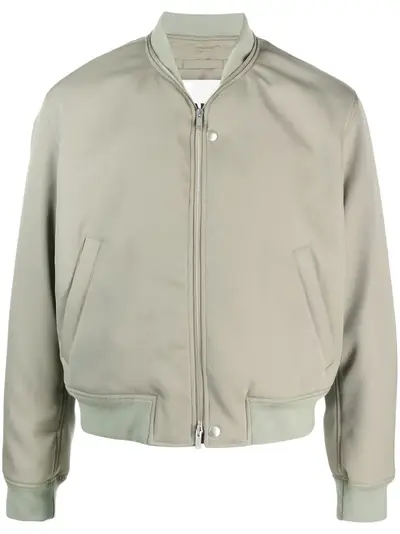 light olive green wool/virgin wool blend/cotton baseball collar front zip fastening long sleeves elasticated cuffs two side welt pockets elasticated hem