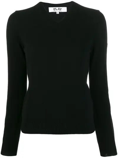 Laid-back style with a playful twist is the look at Comme Des Garçons Play. Presenting this black wool classic knit sweater from Comme Des Garçons Play. Featuring a v-neck, long sleeves and a ribbed hem and cuffs.