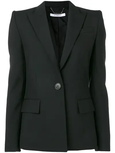 This single-breasted Givenchy blazer commands attention and exudes some of the labels defining house codes. Crafted in Italy from black wool, it features peaked lapels, a front button fastening, long sleeves, button cuffs, a chest pocket, a fitted silhouette, front flap pockets, a rear central vent and a logo printed lining.