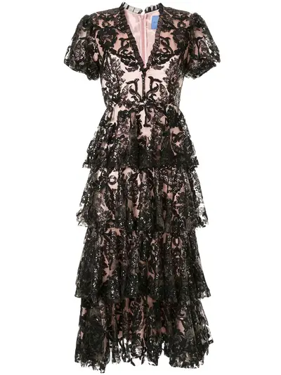 Black and pink silk Parody dress from MacGraw featuring a v-neck, short sleeves, a floral lace pattern, sequin embroidery, a ruffled design and a mid-length.