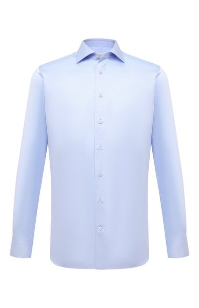 Светло-голубую рубашку с воротником кент раскроили и сшили вручную из мягкого поплина. Этот материал из длинных тонких хлопковых волокон хорошо пропускает воздух, а на ощупь напоминает шелк. На комфорт работают и четко выверенный крой по проверенным годами лекалам, и тщательная подгонка деталей, которые предварительно несколько раз отпарили.