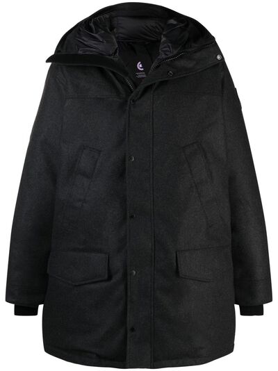 anthracite grey recycled wool blend duck feather padded design classic hood front press-stud and zip fastening drawstring waist long sleeves ribbed cuffs two handwarmer pockets two front flap pockets internal zip-fastening pocket internal backpack straps