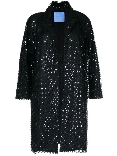 black silk sequin embellishment notched lapels open front three-quarter length sleeves straight hem