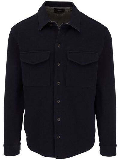 navy blue cotton blend classic collar chest flap pockets front button fastening long sleeves curved hem