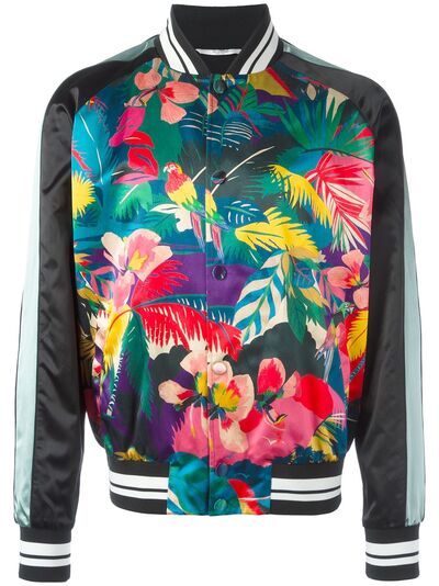The vibrant patterns in Valentino's Resort 2017 collection reflect the cheerful spirit of Cuba. This multicoloured stretch cotton blend bomber jacket from Valentino features a striking tropical print, a stand up collar, a press stud fastening, two front pockets, long sleeves and a striped hem and cuffs.