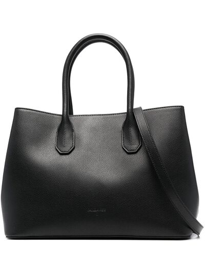 black grained texture embossed logo to the front two top handles adjustable detachable shoulder strap