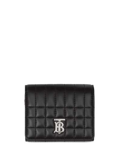 black leather quilted logo plaque tri-fold design coin pocket embossed internal logo internal card slots