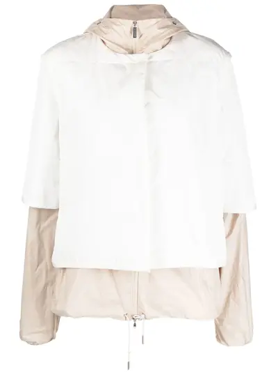 white/blush beige padded design layered design classic hood concealed front fastening long sleeves drawstring hem