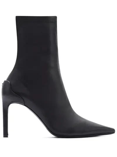 black leather logo patch to the rear pointed toe ankle-length high stiletto heel
