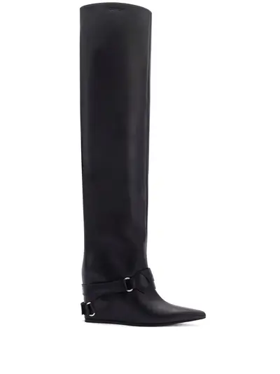 black leather pointed toe silver-tone hardware knee-length wedge heel