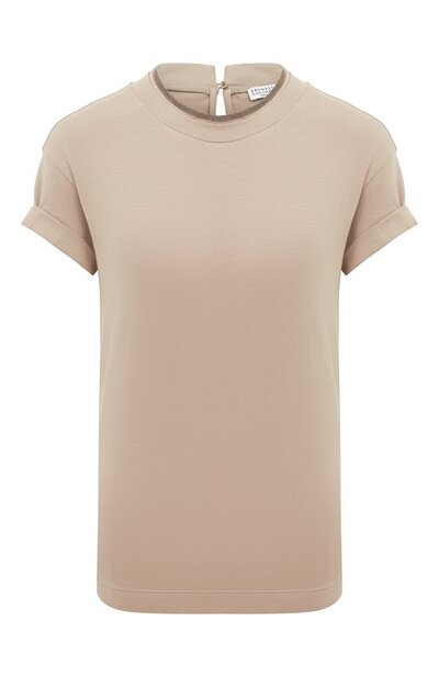 Бежевой футболке с отворотами на коротких рукавах дизайнеры марки, основанной Брунелло Кучинелли, добавили немного блеска, декорировав многослойную горловину фирменными цепочками мониль. Для пошива модели использовали мягкое хлопковое джерси, которое идеально пропускает воздух. Волокна эластана в составе материала сделали изделие более упругим и прочным.
