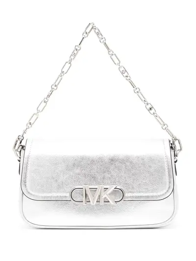 silver-tone calf leather metallic finish silver-tone logo plaque chain-link detailing foldover top main compartment single top handle