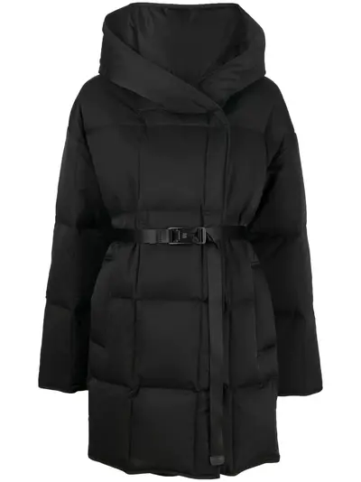 black cotton blend padded design classic hood concealed front fastening belted waist long sleeves two side slit pockets mid-length