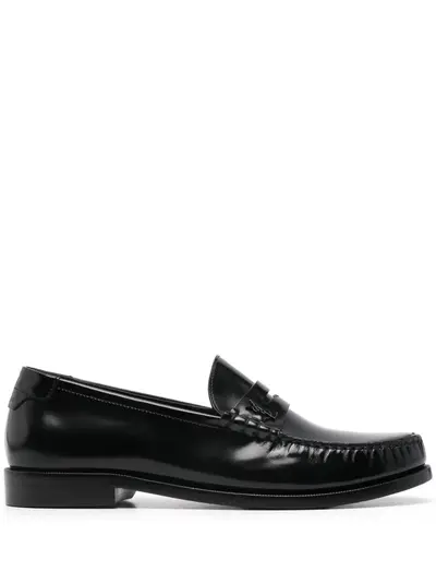 black calf leather logo plaque penny slot slip-on style stitched edge round toe flat leather sole
