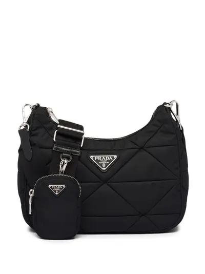black recycled nylon padded design quilted silver-tone hardware enamel triangle logo top zip fastening adjustable detachable shoulder strap removable pouch top zip fastening main compartment