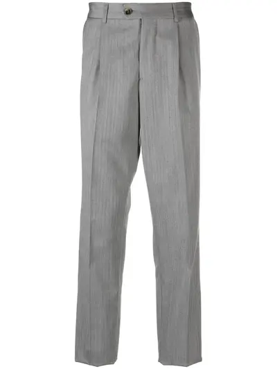 grey virgin wool belt loops button fastening zip fly fastening pleat detailing two side inset pockets two rear jetted pockets straight leg