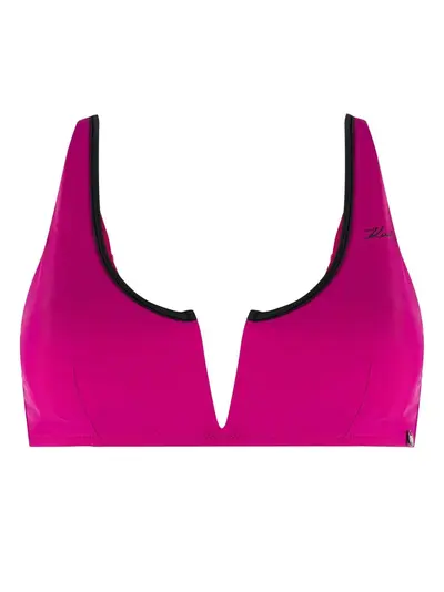 fuchsia pink recycled polyamide logo print to the side round split neck rear clasp fastening sleeveless Be mindful to try on swimwear over your own garments. Conscious: This item is made from at least 50% recycled or upcycled materials. For recycled synthetic clothing products we highly recommend using a microfibre-catching washing bag to ensure that no microplastics that can pollute water are released in the process.
