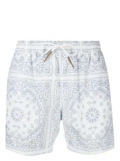 white/light blue paisley print straight leg elasticated drawstring waistband thigh-length Be mindful to try on swimwear over your own garments.