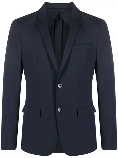 navy blue notched lapels chest welt pocket button fastening two front flap pockets long sleeves buttoned cuffs central rear vent