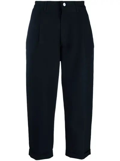 navy blue cotton pressed crease belt loops front button and zip fastening two side inset pockets two rear welt pockets cropped leg