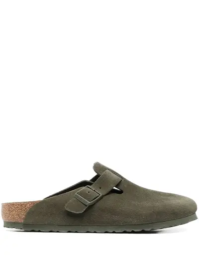 olive green calf suede/leather/cork debossed logo to the side slip-on style buckle fastening round toe ridged rubber sole