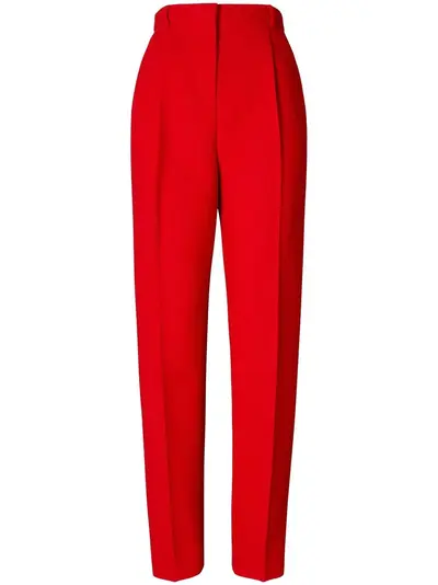 bright red wool pleat detailing high-waisted tapered leg slip pockets to the sides belted waist