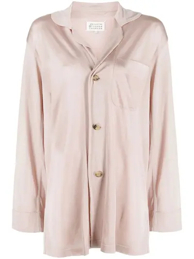powder pink satin finish front button fastening notched collar chest patch pocket signature four-stitch logo long sleeves