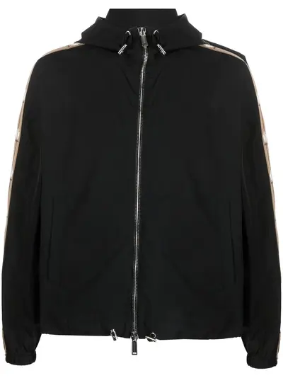 black stretch-cotton contrasting panel detail maple leaf print slouchy drawstring hood front zip fastening long sleeves elasticated cuffs drawstring waist two side welt pockets straight hem