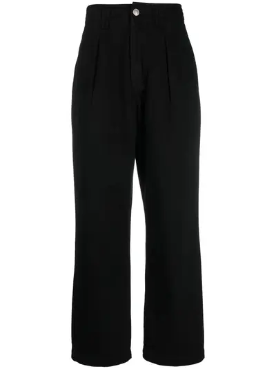 black cotton denim pleat detailing rear contrast stitching belt double-loops front button and zip fastening rear patch pocket
