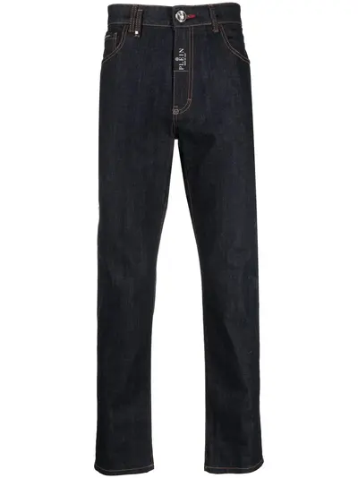 indigo blue stretch-cotton logo patch to the front logo patch to the rear mid-rise belt loops front button and zip fastening classic five pockets straight leg