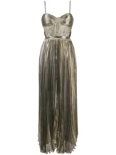 gold-tone silver-tone metallic finish lurex detailing fully pleated adjustable spaghetti straps square neck cut-out detailing rear tie fastening asymmetric hem floor-length