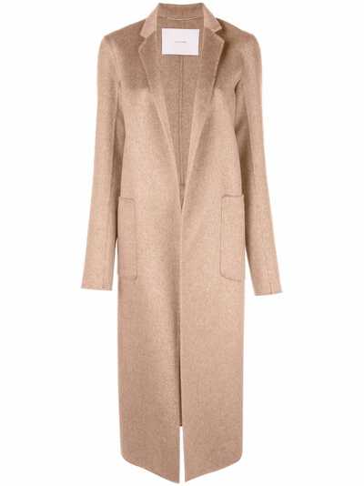 camel brown cashmere notched lapels open front two side patch pockets long sleeves central rear vent straight hem mid-calf length