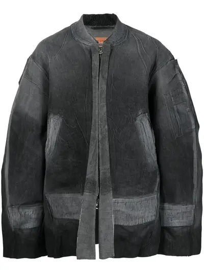grey cotton-hemp blend denim faded effect ribbed detailing raw-cut finish baseball collar front zip fastening long wide sleeves
