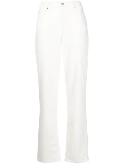 ecru stretch-cotton logo patch to the rear high-waisted front button and zip fastening classic five pockets belt loops straight leg