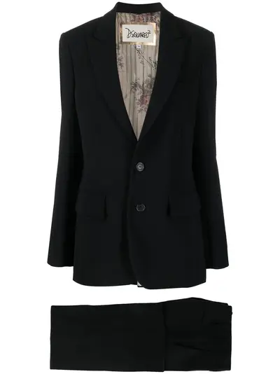black Jacket: peak lapels plunging V-neck front button fastening long sleeves buttoned cuffs two side flap pockets Trousers: mid-rise belt loops two rear welt pockets wide leg