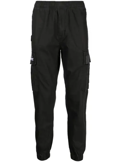 black cotton tapered leg embroidered logo at the leg logo patch to the rear elasticated waistband concealed front fastening elasticated ankles two side inset pockets two side cargo pockets two rear flap pockets