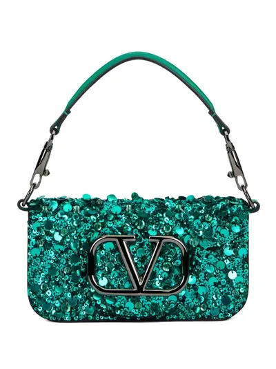 emerald green lambskin sequin embellishment signature V logo plaque foldover top with magnetic fastening detachable leather and chain-link shoulder strap debossed internal logo main compartment
