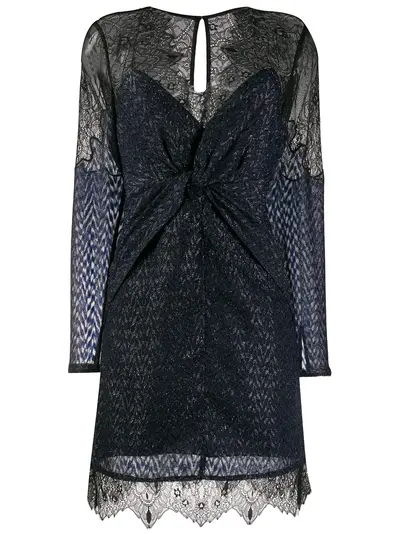 Blue lace knot front dress from Self-Portrait featuring long sleeves, lace panels and a slim fit.
