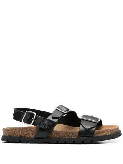 black leather open toe two buckle-strap fastenings buckle-fastening ankle strap moulded footbed flat rubber sole