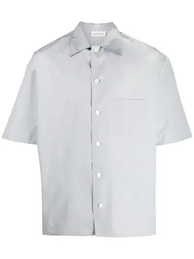 light grey cotton logo print to the rear spread collar front button fastening chest patch pocket half-length sleeves straight hem
